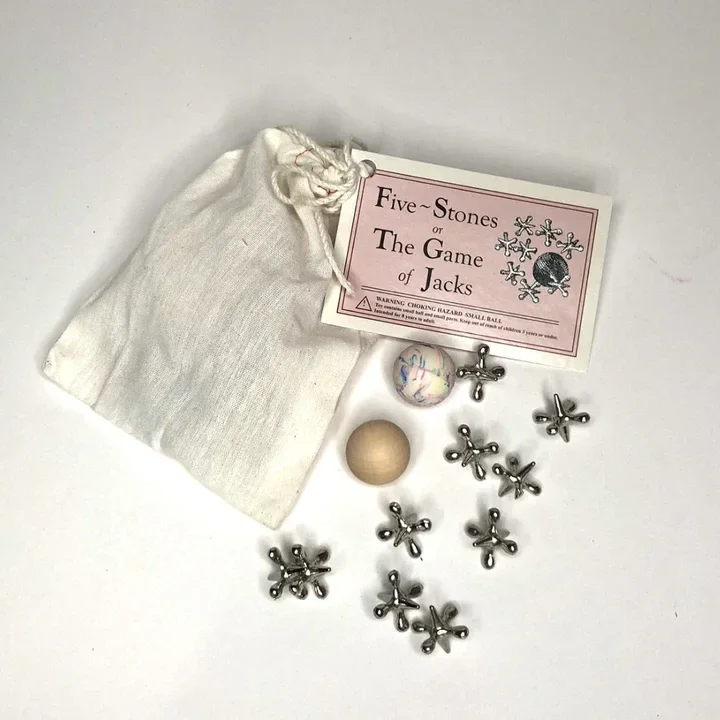 Whether called Iguni, Abhadho, Cincos Marias, or Huripapa, jacks is one of the oldest and most widespread games in the world. All jacks games share a strategy: toss a ball in the air and scoop up pieces before the ball bounces. In this game of skill, almost any collection of small objects will work—beans, rocks, stones, and even bones. Throughout history, kids in virtually every culture on the globe have sat cross-legged and played some version of the game. Cro-Magnon parents may have encouraged their children to play jacks on cave floors, to increase the eye-hand coordination vital to later success at hunting. Kids in ancient Egypt played “knucklebones” with sheep toe bones. The game of knucklebones led to dice games for boys, and jacks, usually played with a wooden ball, for girls. In modern times, kids followed a bouncing rubber ball. The game inspired popular children’s songs such as “This Old Man” (he played one, he played two, and so on). Classic American versions of jacks include Eggs in the Basket, Pigs in the Pen, Jacks on the Rooftop, Five Finger, and Challenge.
